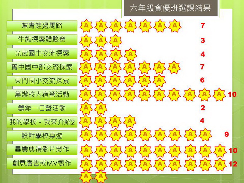六年級統計結果,創造力課程受到較多的青睞。「創意廣告或MV」及「畢業典禮影片製作」居於前兩名,分別獲得12及10個A。為什麼做影片會受到這麼熱烈的支持,不知道是不是受到學長姊的影響?