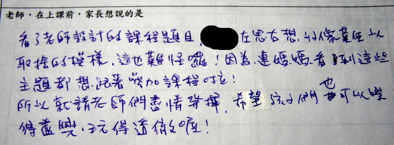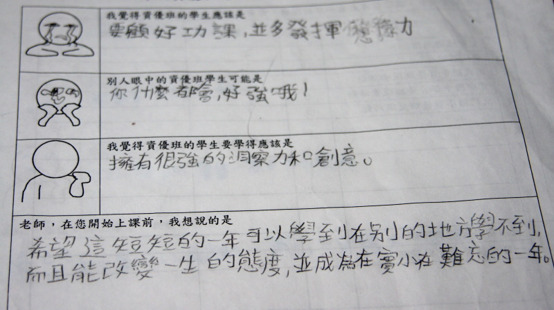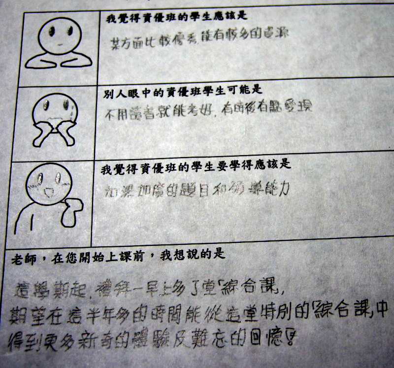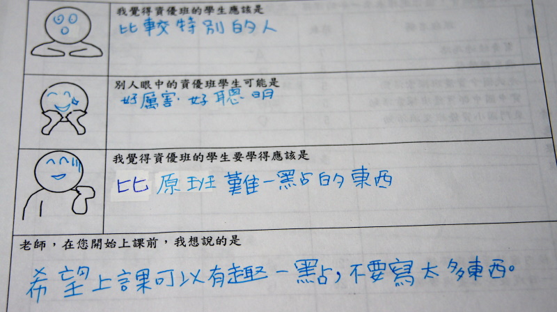 其中,前兩個問題有做一些引導,後面則是自己考量。不需要寫很多,憑著自己的直覺與經驗就好。雖然我這麼說,但是,有些小孩還是猶豫再三,遲遲不敢下筆,不敢輕易自己做決定。多數學生對於前兩個問題的回答都是「聰明、自主」,也有少部分認為資優班學生反而比較容易害怕失敗,不過,整體來說,書面資料顯示,正面反應較多。可是,觀察實際表現,感受到部分學生卻是退縮與消極,缺乏對於學習的渴望,更缺乏面對挑戰的自信。這是目前五、六年級資優班學生明顯不同的地方。是因為他們真的太忙了嗎?