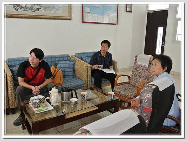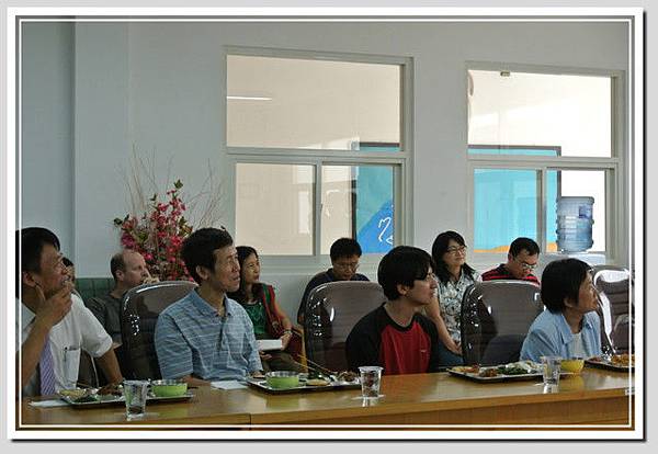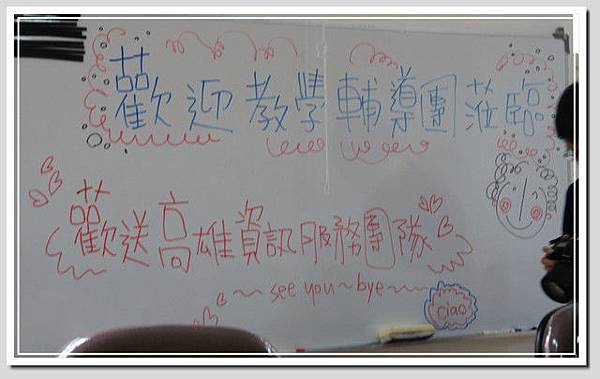 早上的課程很順利,接著,中午到會議室參加了學校的歡迎歡送會。室內擺了許多青菜、水果、披薩等,一方面歡迎我們四位教師以教學輔導團的名義到來,一方面歡送高雄資訊志工團,這是他們住校的第十天了。