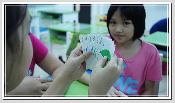 決定先照著計劃走,同樣是分數牌,但是拿的是另一種牌,有各種分母的分數牌,先讓他們玩的是「撿紅點」,也就是手中的牌和桌上的牌可以加起來成為1的,就可以吃下得分,準備進行的是同分母和異分母的加法討論。