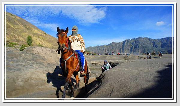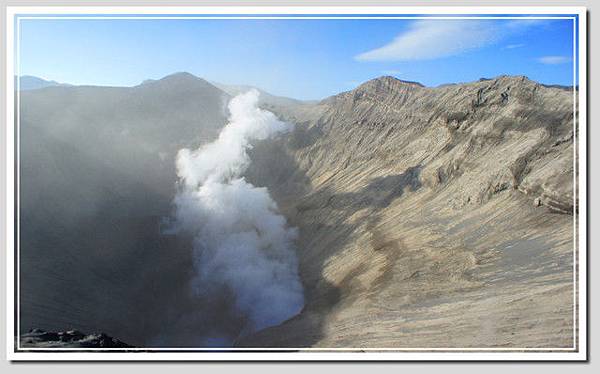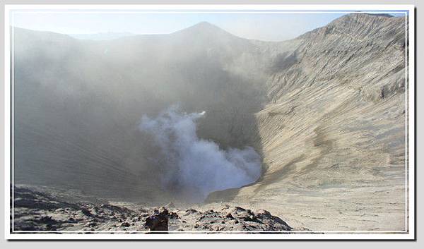在火山口,硫磺味刺鼻,但不是太濃,陣陣白煙裊裊,火山內感覺相當寧靜。眼前的婆羅摩就像溫柔的母親,絲毫感受不到爆發的可怕。