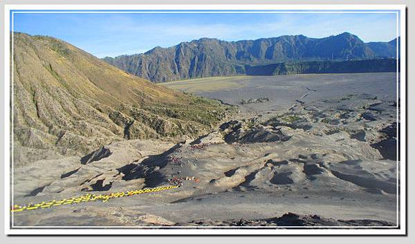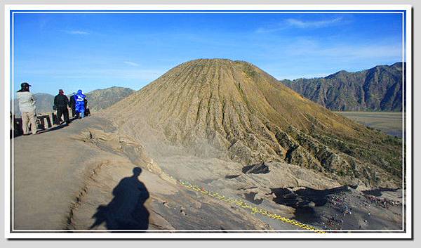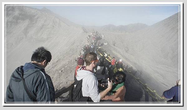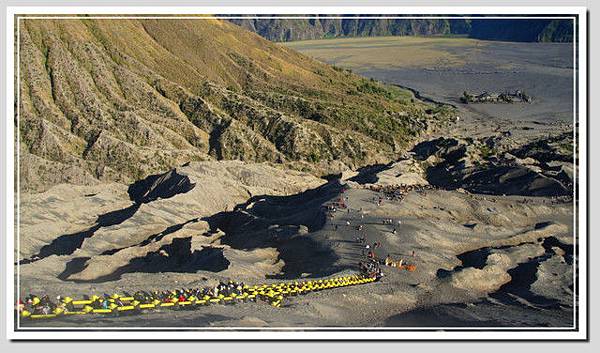 走過大片沙地,快到火山基部時,馬伕終於同意了去回共五萬。女士們一一同意了。至於男生們,陳老師健步如飛,要靠著自己的雙腳征服婆羅摩,年輕二十歲的我又怎能仰賴馬兒呢?決定加入雙腳無敵團,繼續一步一腳印的往前走。從踏上斜坡開始,真的是一步一腳印了,踏下去的腳印不但完整,深度至少四公分,越走越辛苦。