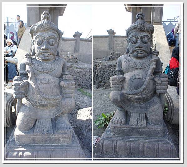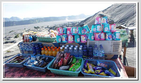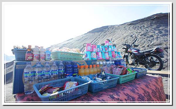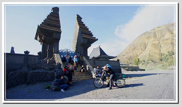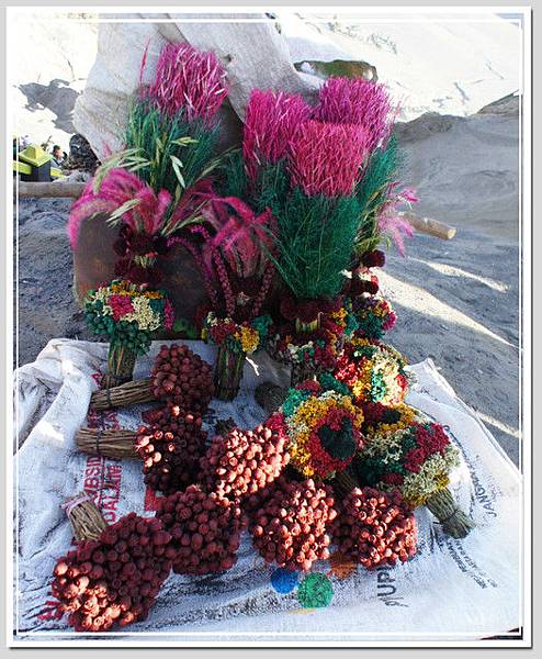火山口有人賣著花束,用來祭拜山神的。網路上有一個婆羅摩火山的傳說故事,發生在西元1530年左右,在那之前,爪哇島上是印度教建立的「滿者伯夷」王國統治,但伊斯蘭教入侵後,滿者伯夷一路東遷,其中有一族叫做滕古爾族(有些網站稱為登格爾族),來到了這火山群中,建立了天吉兒村,並且建立了一座印度廟守護莊園。