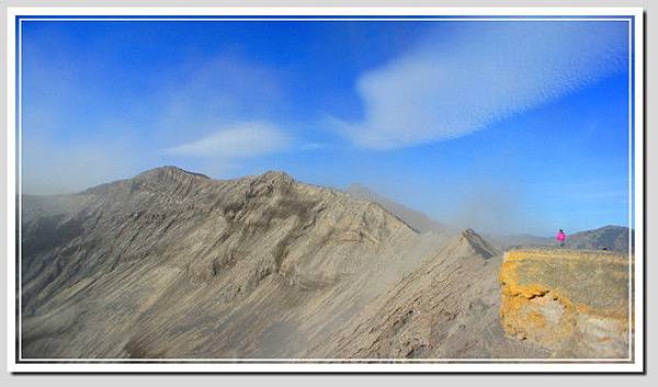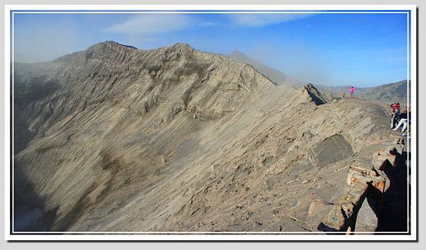 在火山口風大沙多,圍繞火山口的路只有兩個人的寬度,繼續往前走,甚至只有一個人的寬度,並不寬敞,而且有一段路雖然有柵欄,看起來卻不怎麼堅固。