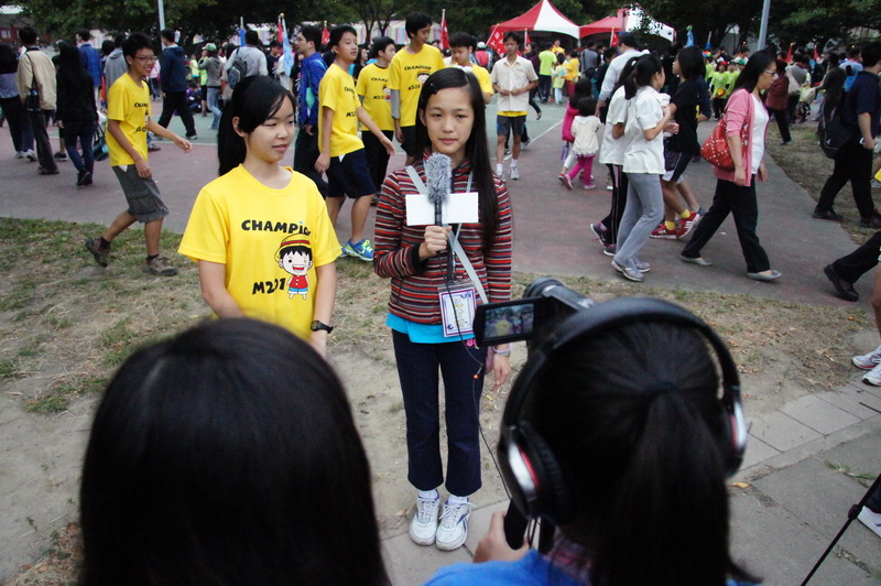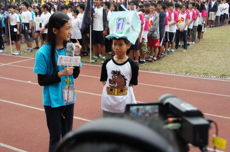 不過,從運動員集合到進場的時間實在太短,我們大約只有十分鐘可以採訪,所以,預計要採訪的五年級沒能進行。小記者告訴我這個訊息,覺得相當可惜,為免日後剪接時的遺憾,趁著開幕典禮進行時,趕緊拉著記者到跑道邊緣,並請一位小記者去五年級的隊伍中找人,補上這個差點無法執行的計畫中採訪。