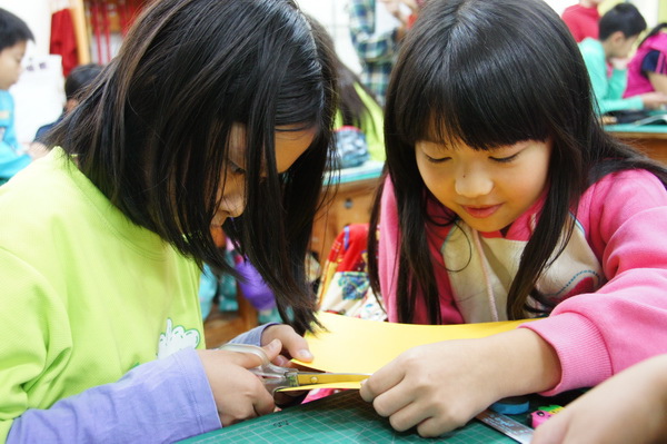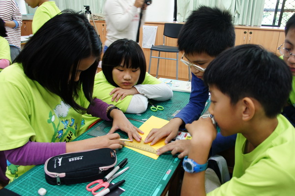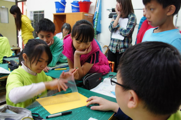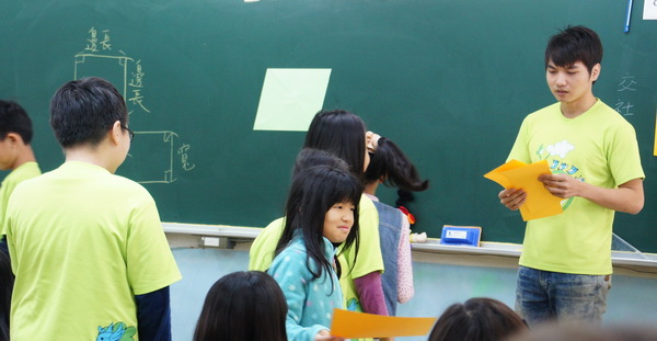 各組學生開始討論作法,不過,作法大都一致。唯一不同的是第一組,他們將平行四邊形剪去多餘的部分,剩下縮水的長方形,就當作完成任務。