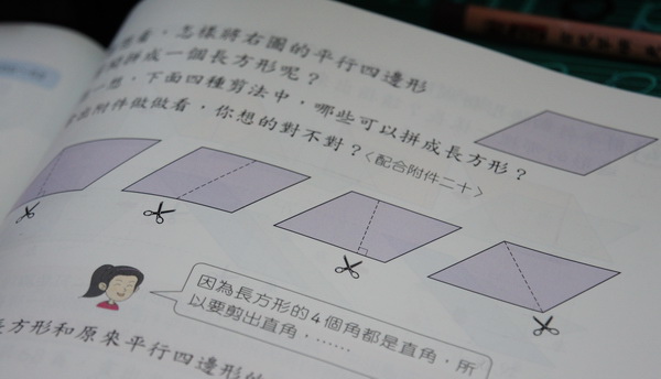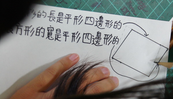比較特別的是第一組,他們將兩邊的三角形剪掉,讓平行四邊形變成長方形,接著卻又把兩個三角形貼回去,又變回平行四邊形。