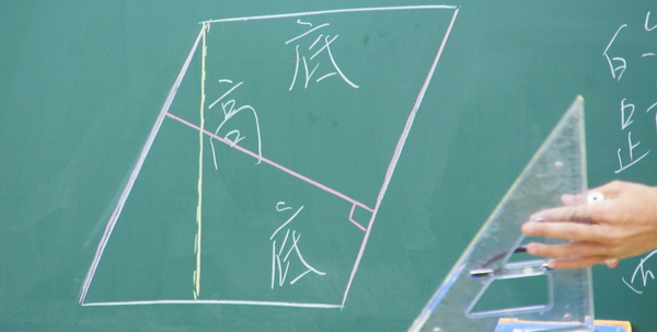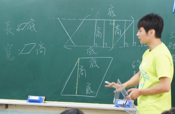 這一階段讓學生較為迷惑,雖然有學生會直接說出平行四邊形的面積是底乘以高,卻無法正確說出何謂底、何謂高。尤其是「高」的表示有困難。有小組說長方形的「長」就是平行四邊形的「長」,長方形的「寬」就是平行四邊形的「寬」。而且容易把平行四邊形的斜邊和高混淆,這些困境是背公式解題無法看到的。在小組討論中,或許能做第一步的釐清。