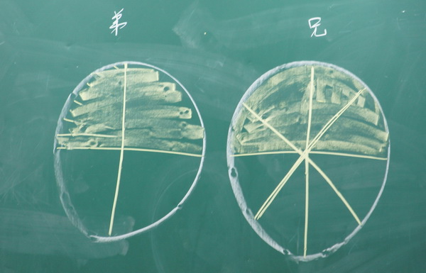 4.第二節課是累加單位分數,慢慢「聚」成m/m=1,第三節課的兄弟披薩問題,也有學生畫出1/2的等值分數,本節課先讓學生思考如何分割,可以讓兄弟吃的一樣多,認識更多的等值分數,然後讓學生透過操作進行等值分數的「化」,經驗1=m/m。