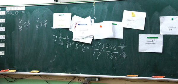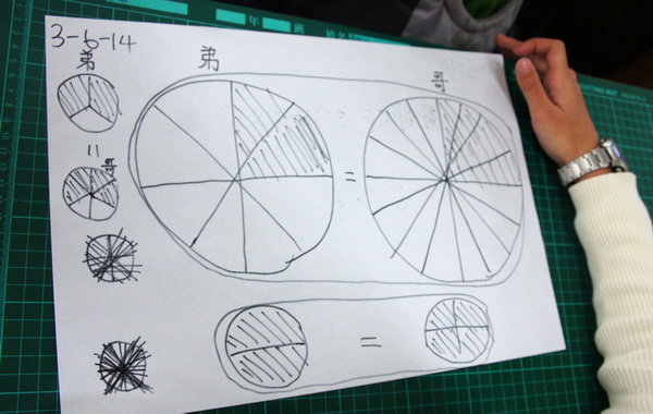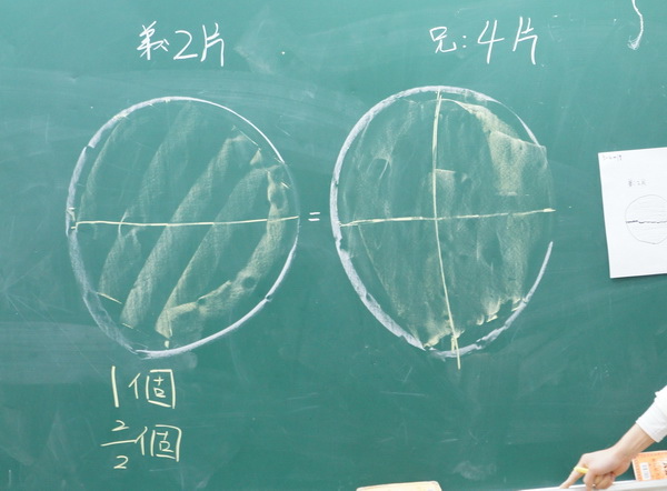 2.三年級的等值分數只處理1和1/2,但教材的練習題中卻出現1/3=2/6的超過範圍的題目,為了符合三年級只是「經驗」等值分數的教學目標,除非學生自己發展出來,否則老師不刻意提到其他分數的等值分數。