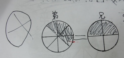 7號在一個圓上分成4等分,哥哥在其中1等分中又平分4等分;弟弟占了2等分。