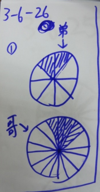 【布題一】延伸上節課的情境去做思考。已知哥哥和弟弟的披薩都是一樣的尺寸,要怎麼等分,才會讓哥哥吃4片,弟弟吃2片時,他們吃的會一樣多呢?(畫圖,然後以符號紀錄)