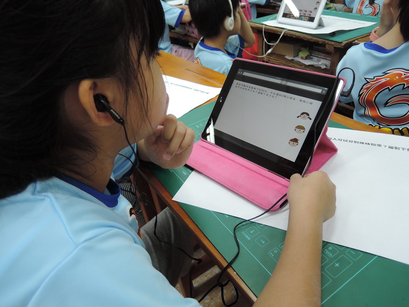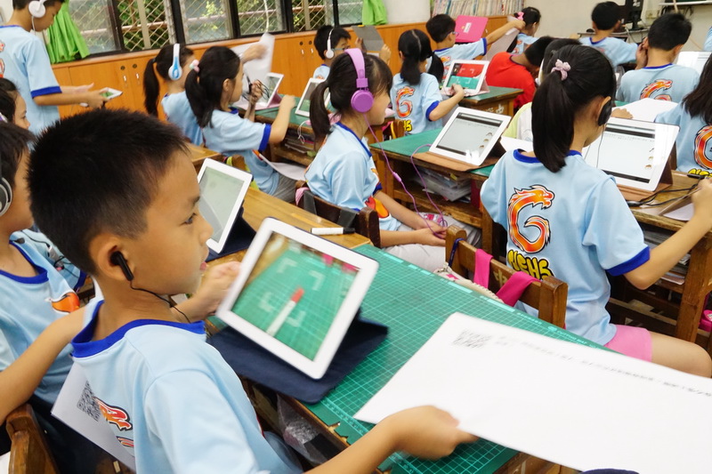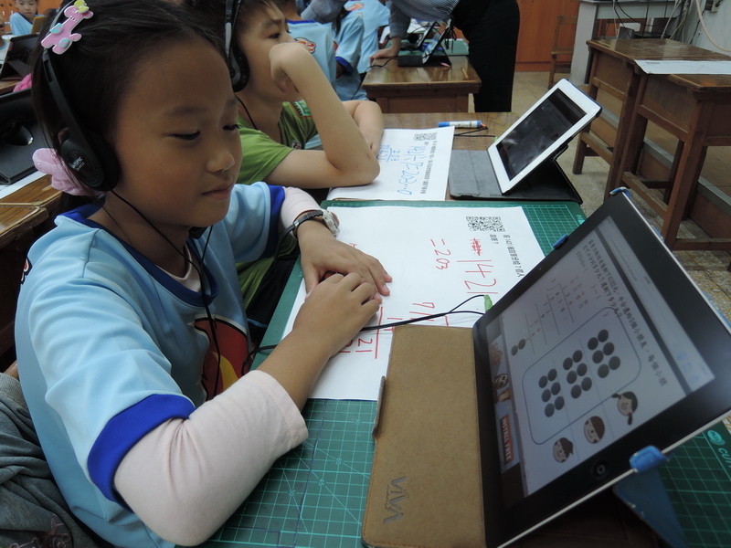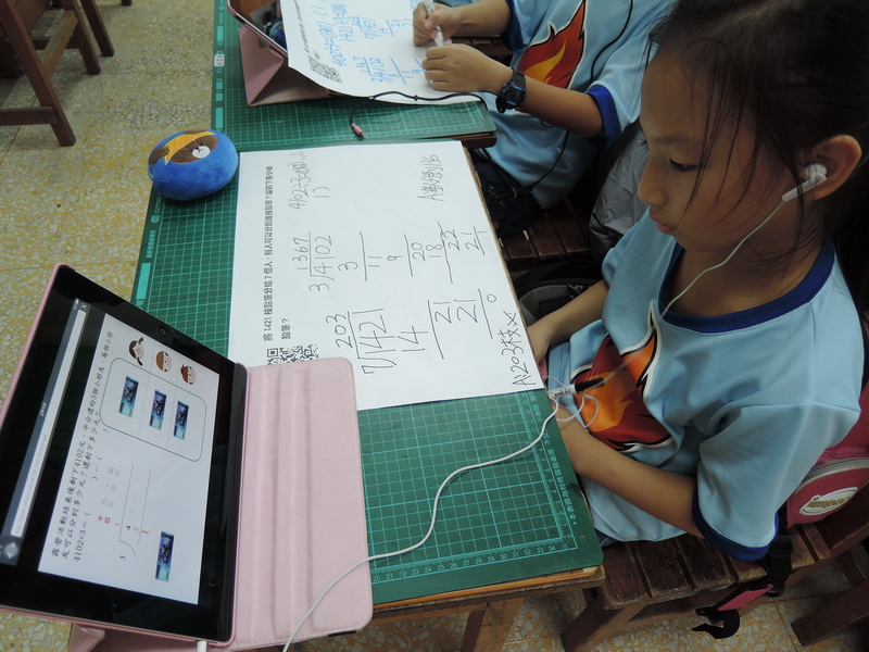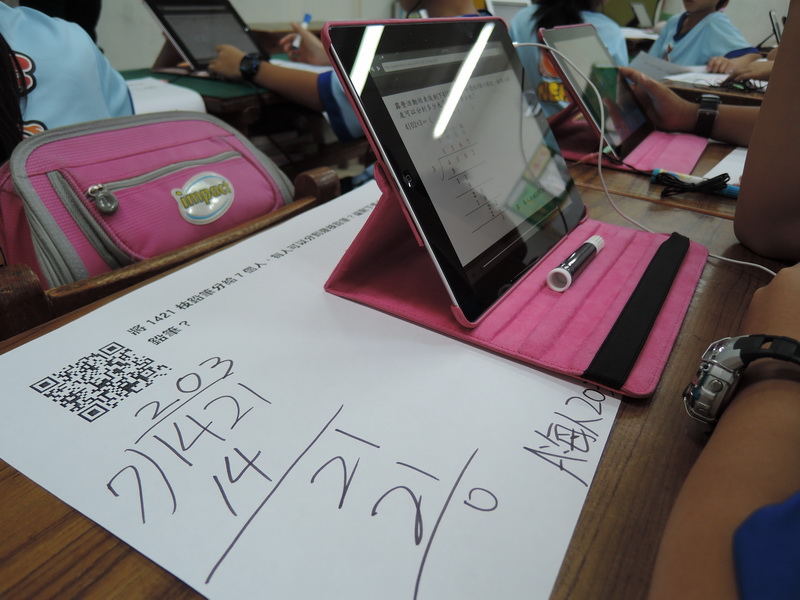 課堂一開始,學生先使用平板電腦,在老師發下一人一張的題目紙上找尋QR code,掃描後就會出現教學影片。
