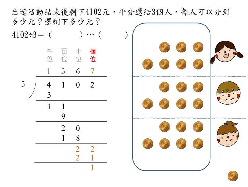 均一教育平台的影片製作有許多規範,或許有其心理學的理論基礎,但是,我在思考影片製作時,只想著,如何把這概念清楚的呈現。如果這概念可以透過操作去發現,就不適合做影片,直接現場給學生去動手的效果最好。但是,有些沒法給學生去動手,或是動手操作效果也不會比較好,或是老師示範需要花很多時間在說明的,或許,影片會是個方法。因此,這次選了「四位數除以一位數」的教學目標,透過錢幣的布題與解題歷程,讓學生清楚看到每個步驟所代表的具體意義,希望學生不但會直式紀錄,還能把直式紀錄的各步驟意義說出來。
