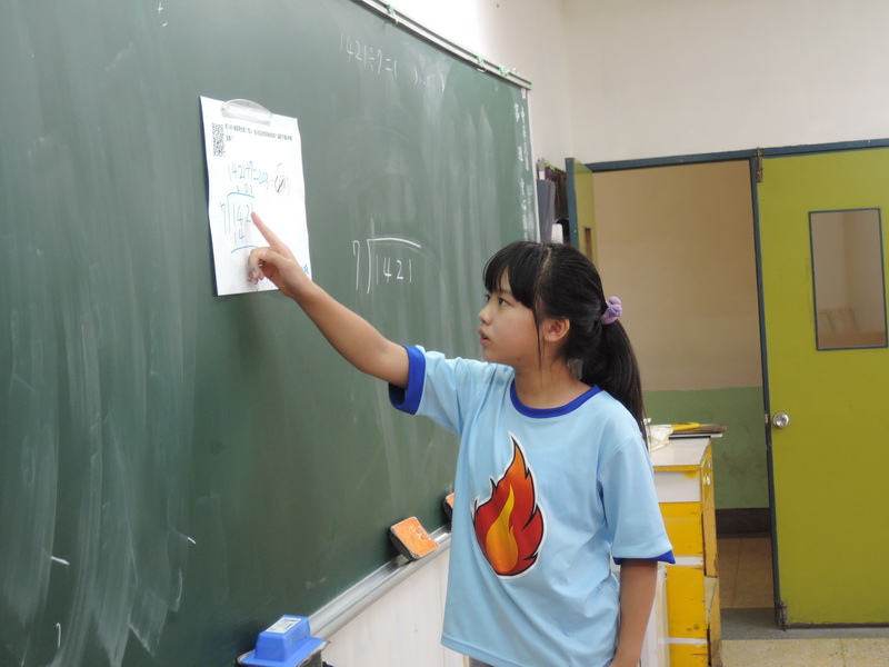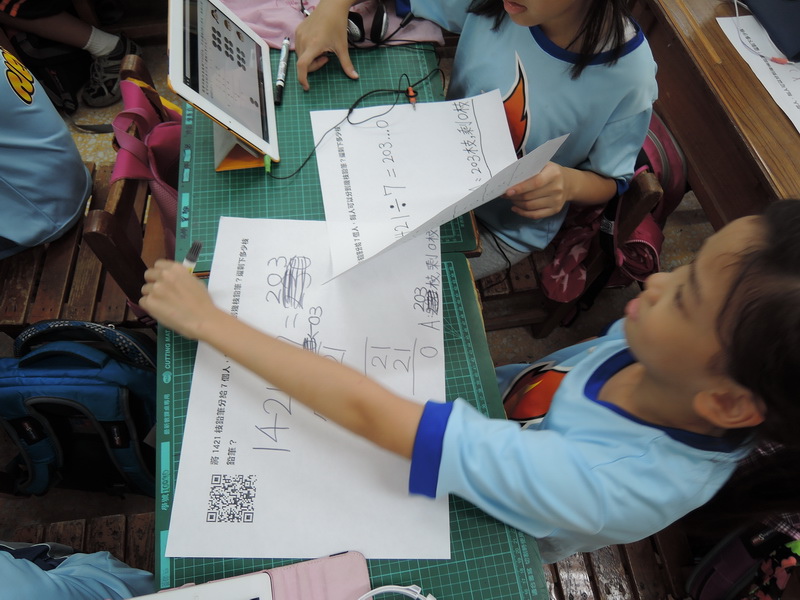 接著,另一位學生再補充:「1421除以7,14個百分給7個人,每人分到2個百,剛好分完,所以沒有剩。2個十不能分給7個人,所以每人分到0個十,因此換成20個1,和1個1合成21個1。」在直式紀錄時,第一層為14-14,第二層直接寫21-21。有學生馬上提出疑問,為什麼商的十位數字補0,可是第二層算式沒有出現0乘以7等於0?