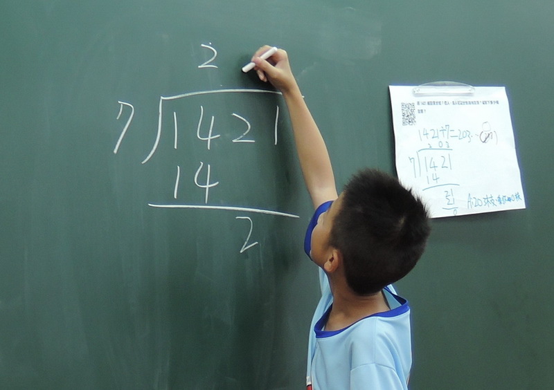 上台發表。學生講解算式已經不單單是幾乘以幾,還可以說明千位的1是1個千,不能分給7個人,所以換成10個百,和4個百合成14個百,分給7個人,每人得到2個百。講解時有模有樣,叫人驚訝。