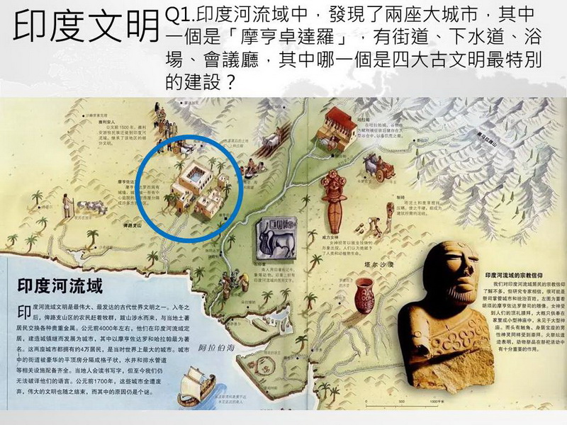 這一堂課是四大古文明的第三個─印度古文明。在正式進入課程前,就先複習了一下兩河流域及埃及的大河,也考考學生,印度河現在並不在印度國家內,而是在哪一個國家?學生從翻查課本內的世界地圖就可以找到答案─巴基斯坦。也稍微說明一下,巴基斯坦原本也是印度的一部分,只是後來因為宗教的因素獨立出來了。