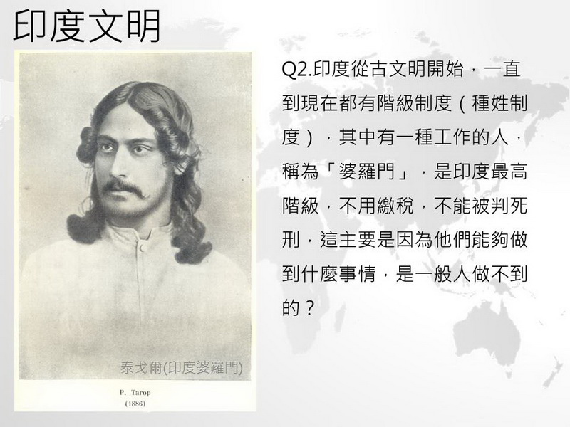 考古遺址只用一題結束掉,接下來就進入印度最特別的種姓制度。首先從「婆羅門」認識起,這是印度最高階級,地位非常的高,不用繳稅,不能被判死刑,這主要是因為他們能夠做到什麼事情,是一般人做不到的?