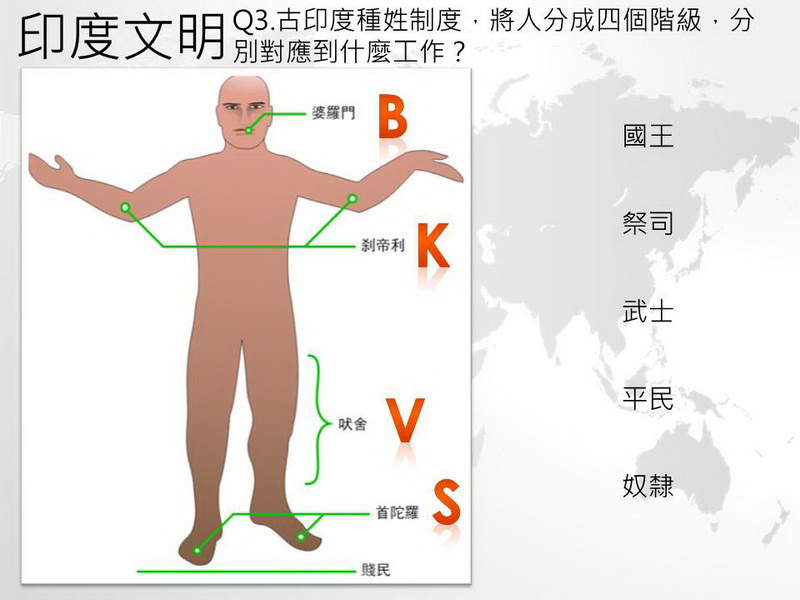 這個題目,原本設計就是要讓他們驚訝。古印度種姓制度,將人分成「四」個階級,分別對應到什麼工作?題目明明寫四個等級,但是圖上卻出現五個階級名稱─婆羅門、剎帝利、吠舍、首陀羅跟賤民。而右邊要對應的職業類別也是五個─國王、祭司、武士、平民、奴隸。或許剛好五個對五個,所以學生也沒人提出質疑,為什麼寫四個階級,卻出現五個名詞,但是,也因為沒有發現這個關鍵,所以自然就一對一的進行配對。