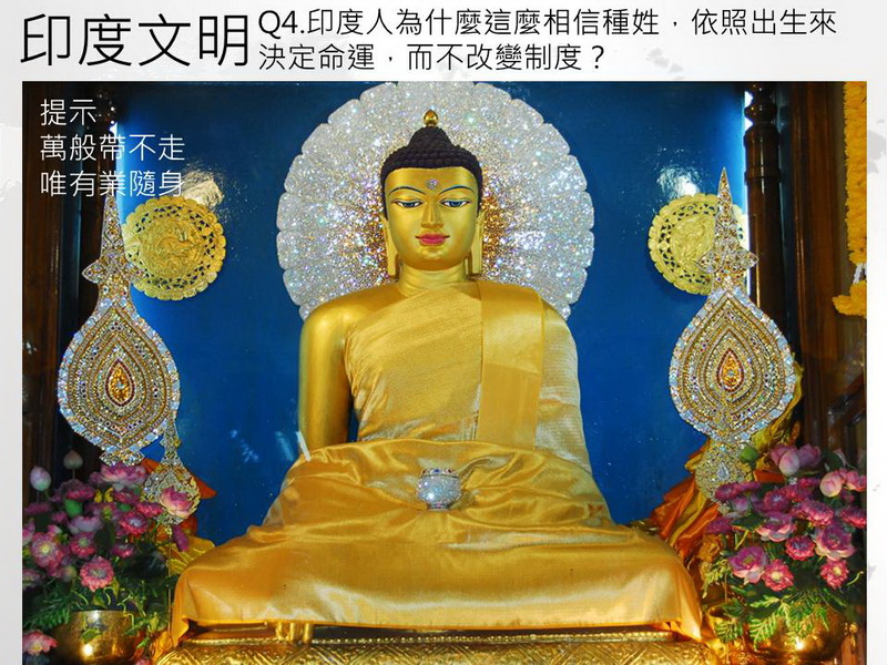 這一題,有點困難,我還給了提示。佛教有句話,跟印度人相信種姓制度很有關係,那就是「萬般帶不走,唯有業隨身」。