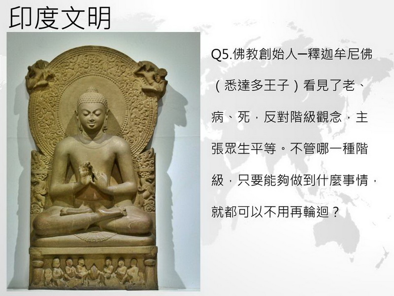 從建築、種姓制度到佛教,我企圖想要把課本介紹古印度文明的四個重點,進行串連的設計,但是,不得不說,關聯性還真不大,四個重點除了都是印度古文明的特色外,就沒有一個思考可以串起來了,當然,也包括第四個主題。