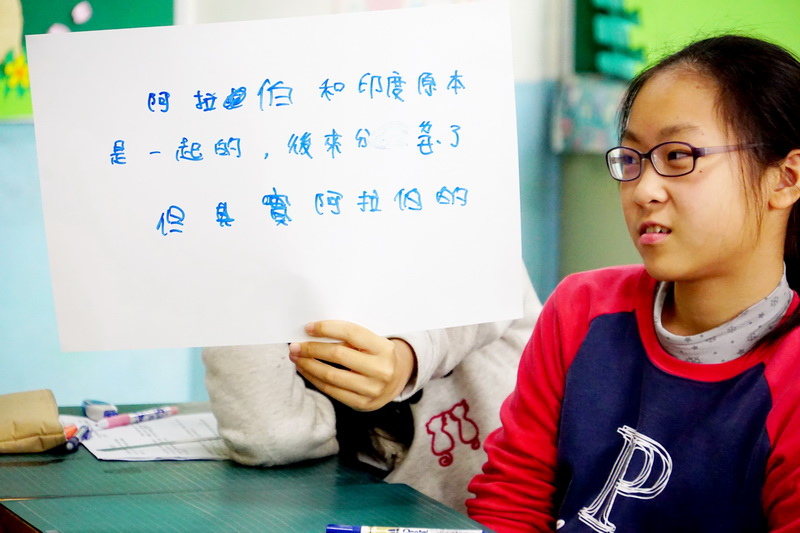 第二組寫「阿拉伯和印度原本是一起的,後來分裂了,但其實是阿拉伯的」。從學生寫的文字中,可以感覺到學生真的有聽課,而且聽進去了。這堂課一開始,我說到印度河現在其實不在印度國界內,而是在巴基斯坦,為什麼會這樣呢?因為巴基斯坦原本是印度的一部份,後來因為宗教因素而分裂了,瞧!這答案,是不是從一開始而來的,是不是證明小朋友真的有聽課呢?