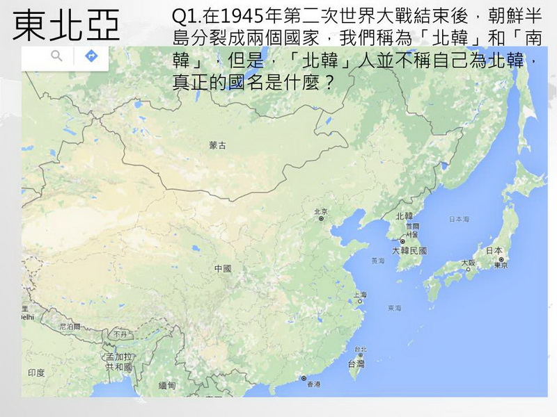 Q1.在1945年第二次世界大戰結束後,朝鮮半島分裂成兩個國家,我們稱為「北韓」和「南韓」,但是,「北韓」人並不稱自己為北韓,真正的國名是什麼?