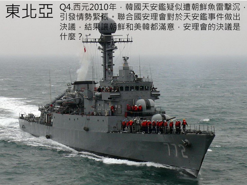 Q4.西元2010年,韓國天安鑑疑似遭朝鮮魚雷擊沉,引發情勢緊張。聯合國安理會對於天安鑑事件做出決議,結果讓朝鮮和美韓都滿意,安理會的決議是什麼?