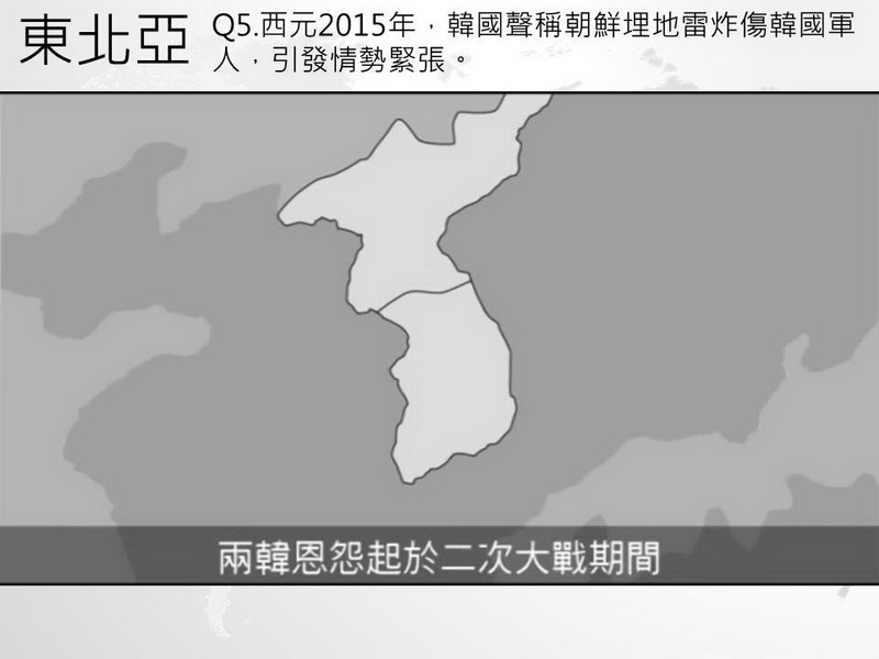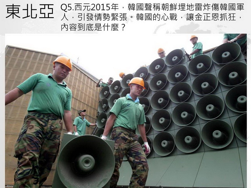 Q5.西元2015年,韓國聲稱朝鮮埋地雷炸傷韓國軍人,引發情勢緊張。韓國的心戰,讓金正恩抓狂,內容到底是什麼?