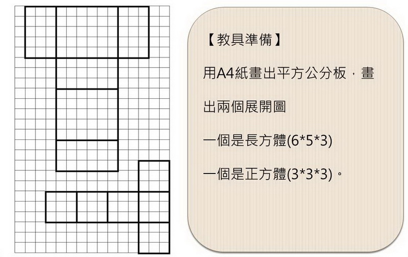先在平方公分板畫出一個長方體和一個正方體的展開圖,讓每個面都能看到一個個的一平方公分。