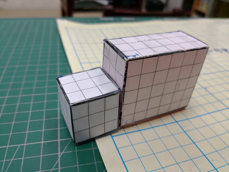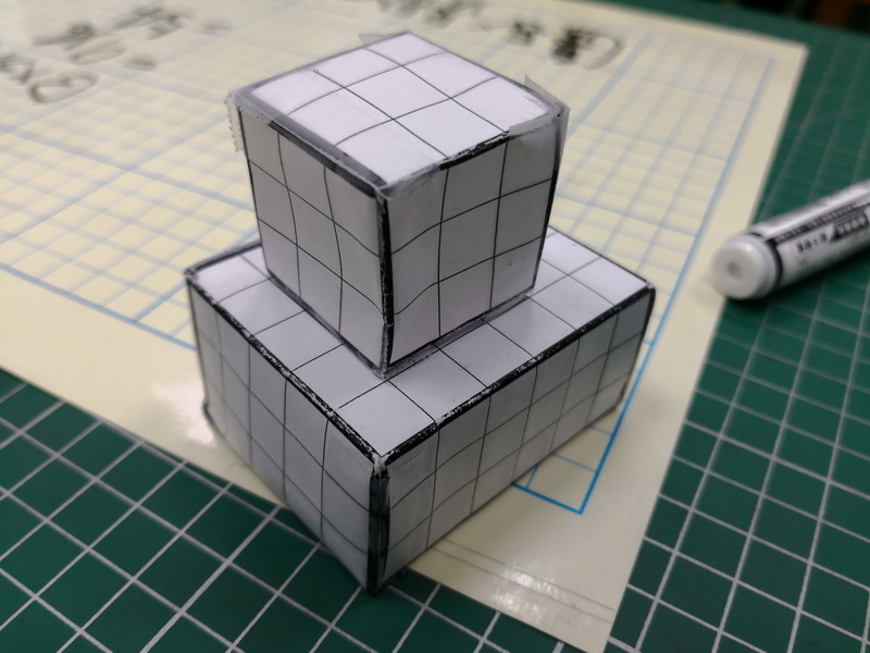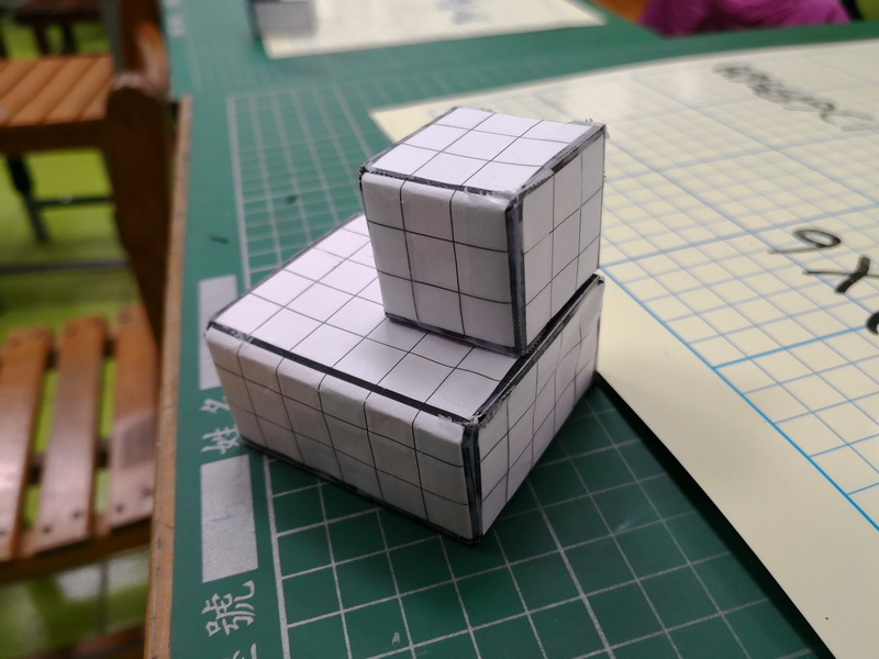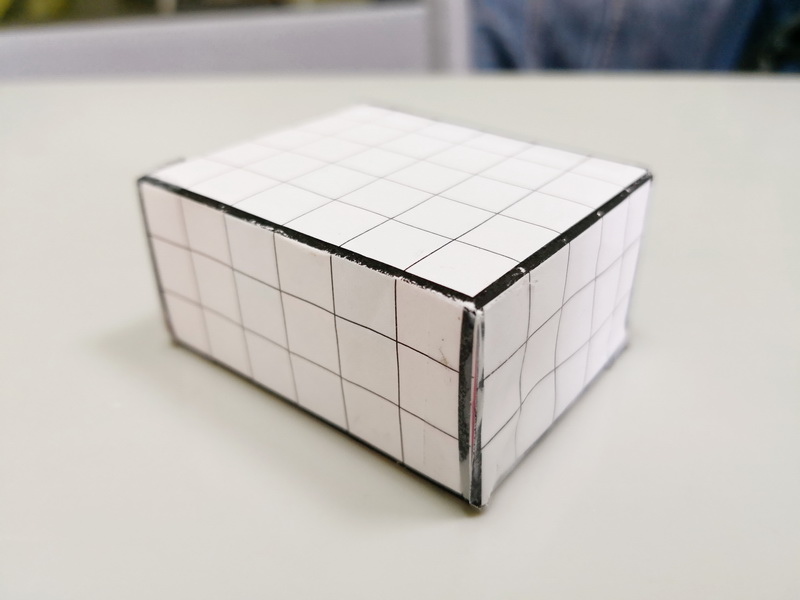 展開圖剪下後,開始在裡面塞入小白積木,一顆顆的一立方公分就放進盒子裡。形成表面有許多1平方公分格子、裡面有許多1立方公分積木的盒子。