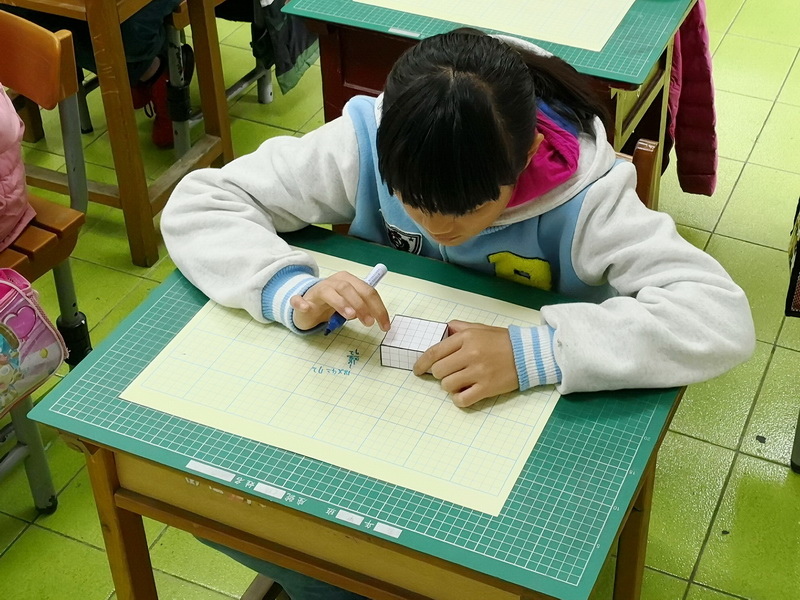 師:現在請你算算看,盒子表面總共有多少個格子。看看怎樣算速度最快。在你們桌上有小白板,可以把它當作計算紙,做些紀錄。