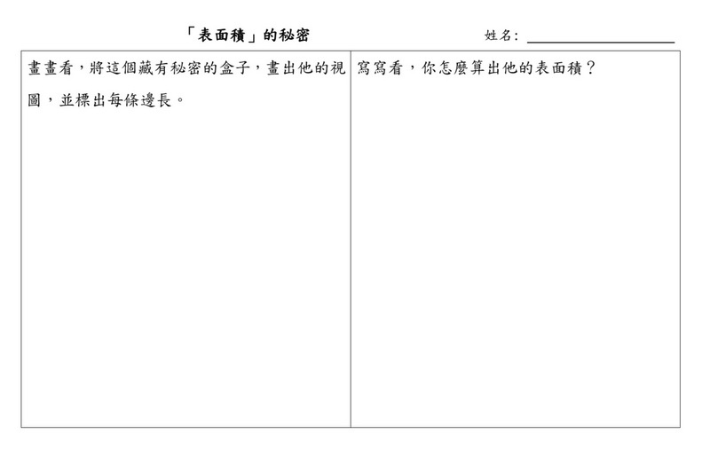 師:「接下來,我要請你們把剛剛做的事情,整理到這一張任務單上,左邊是將桌上的盒子畫下來,畫的是視圖,這不好畫,你們盡力就好,盒子上面一格一格的,可以不用畫下來,只要標示出來邊長就可以了。主要是在盒子拿走之後,別人還是知道,你算的是什麼形體。右邊,則是把剛剛在小白板的計算過程,整齊的寫下來。」