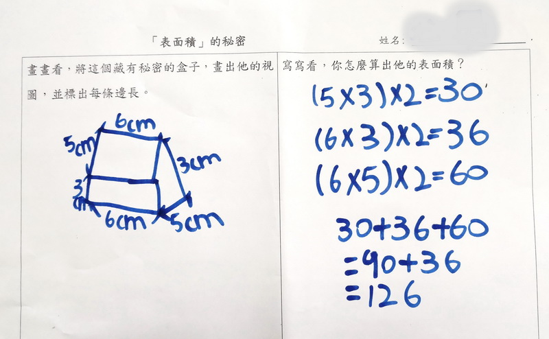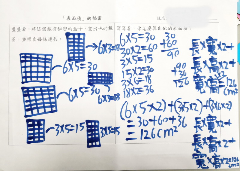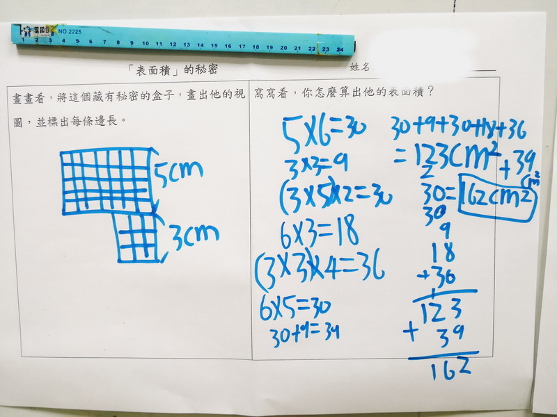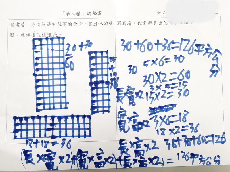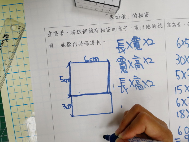 長方形面積公式開始派上用場,小朋友開始用長乘以寬去計算每一面的面積,然後加起來。