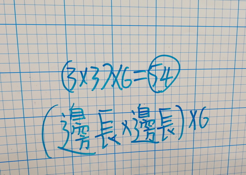 隔天,給每位學生一個正方體,因為是長方體的特例型,學生覺得很簡單,很快就都寫出3×3×6,也很快轉換成正方體表面積公式為邊長×邊長×6。