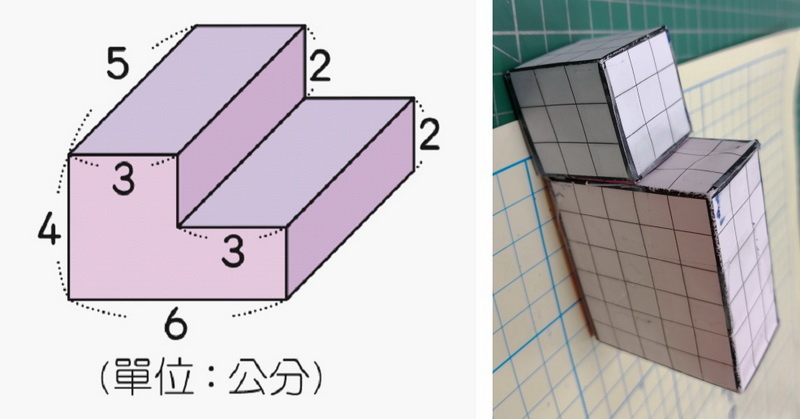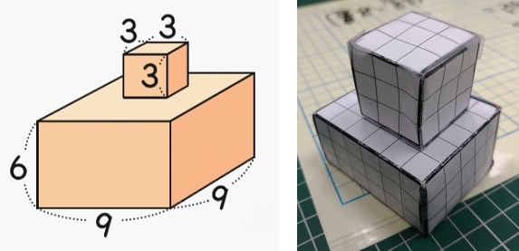 第二位學生,組合出來的是生日蛋糕型,從他的計算過程可以知道,他是將正方體的表面積加上長方體的表面積,然後扣掉重疊的兩個面。