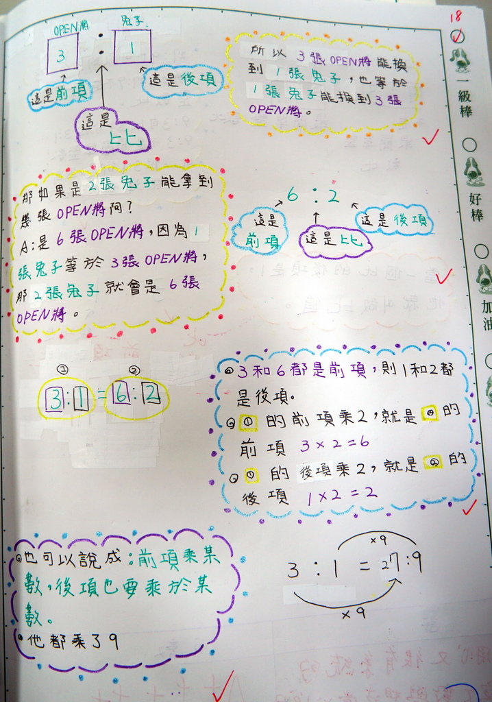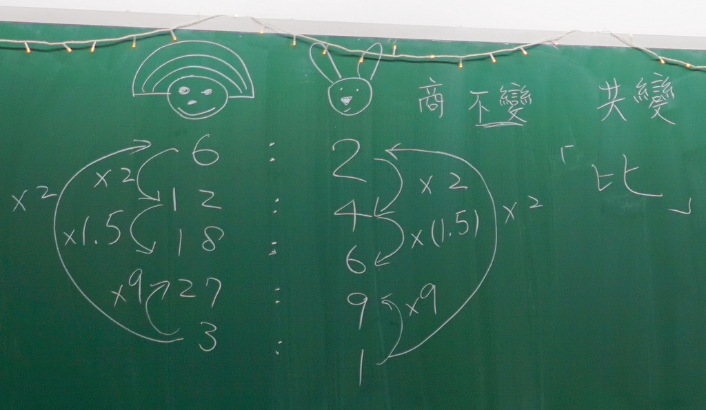 比與比值,我們從「交換的比」切入,對於常常有兌換點數經驗的學生來說,相當生活化,在多組例子中看見比例關係後,順勢帶入比的相關名詞,雖然許多是新名詞,不會一堂課就熟悉,不過,接著還有「組合的比」、「母子的比」、「密度的比」以及「伸縮的比」,各種情境的比,都會有這些名詞後,就會慢慢熟悉他們了。