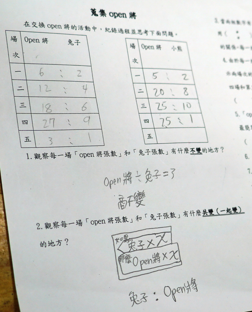 每一場次結束後,就會訪問最快速的小組,分享一下訣竅。「我們把open將每3個就放一疊。」這是很直覺、又普遍的訣竅,這時候,3這個數字在這場遊戲中,特別令人印象深刻了,也是這組交換問題中的關鍵,那是比值的具體意義,很自然就在做前項除以後項,而且是意義的做這個運算,讓比值的產生有其意義。
