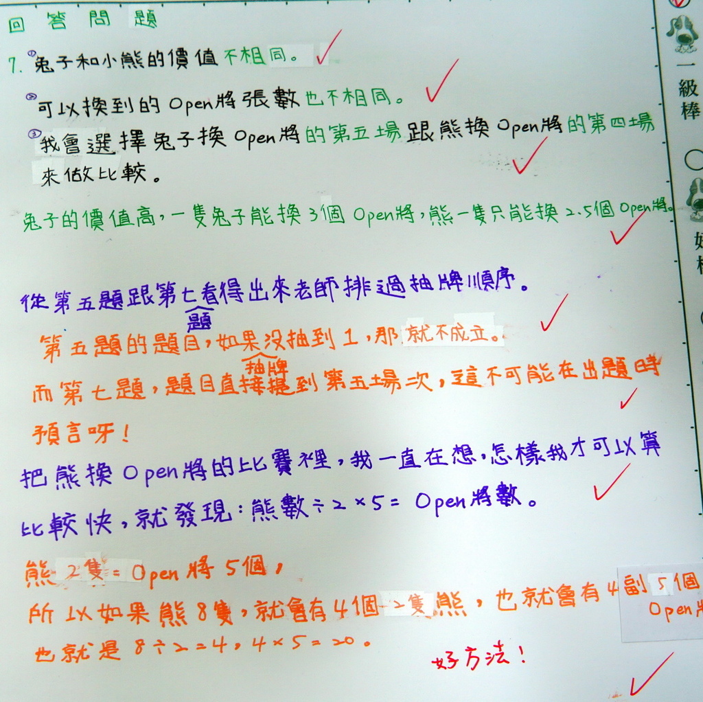 「第二場,我要4隻兔子。」這時候幾乎全班都很快了,當然,還是有兩個小組尚未發現關鍵,仍然一張一張慢慢數,然後才緩慢地站了起來,於是,核對完答案之後,還需要靠同學分享一下想法,互相刺激思考。