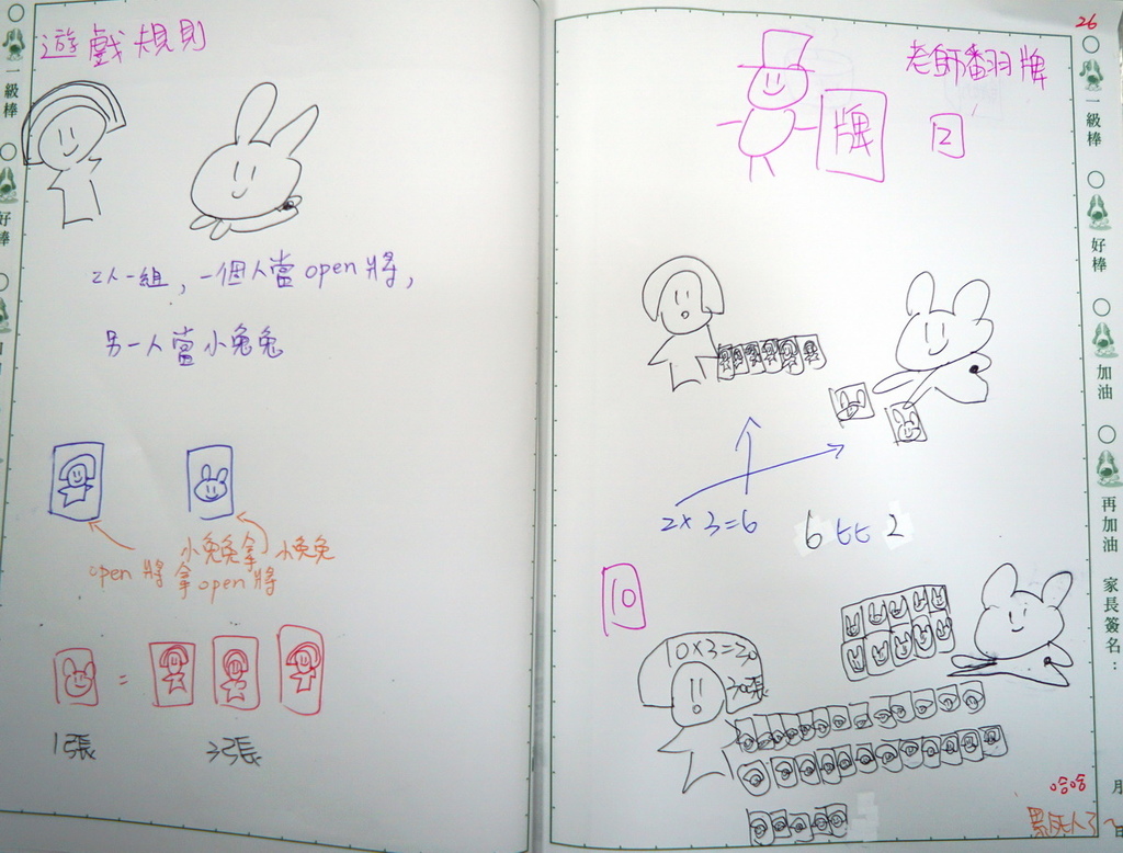 Open將和兔子的牌卡有個交換關係,每三張open將牌卡可以換得一張兔子牌卡,也就是說,每一張兔子牌卡會換得三張open將牌卡。而老師每一場次,會抽出一張撲克牌,上面的數字,就是這場次要拿出來的兔子張數,至於open將張數就要靠你們數出來了。